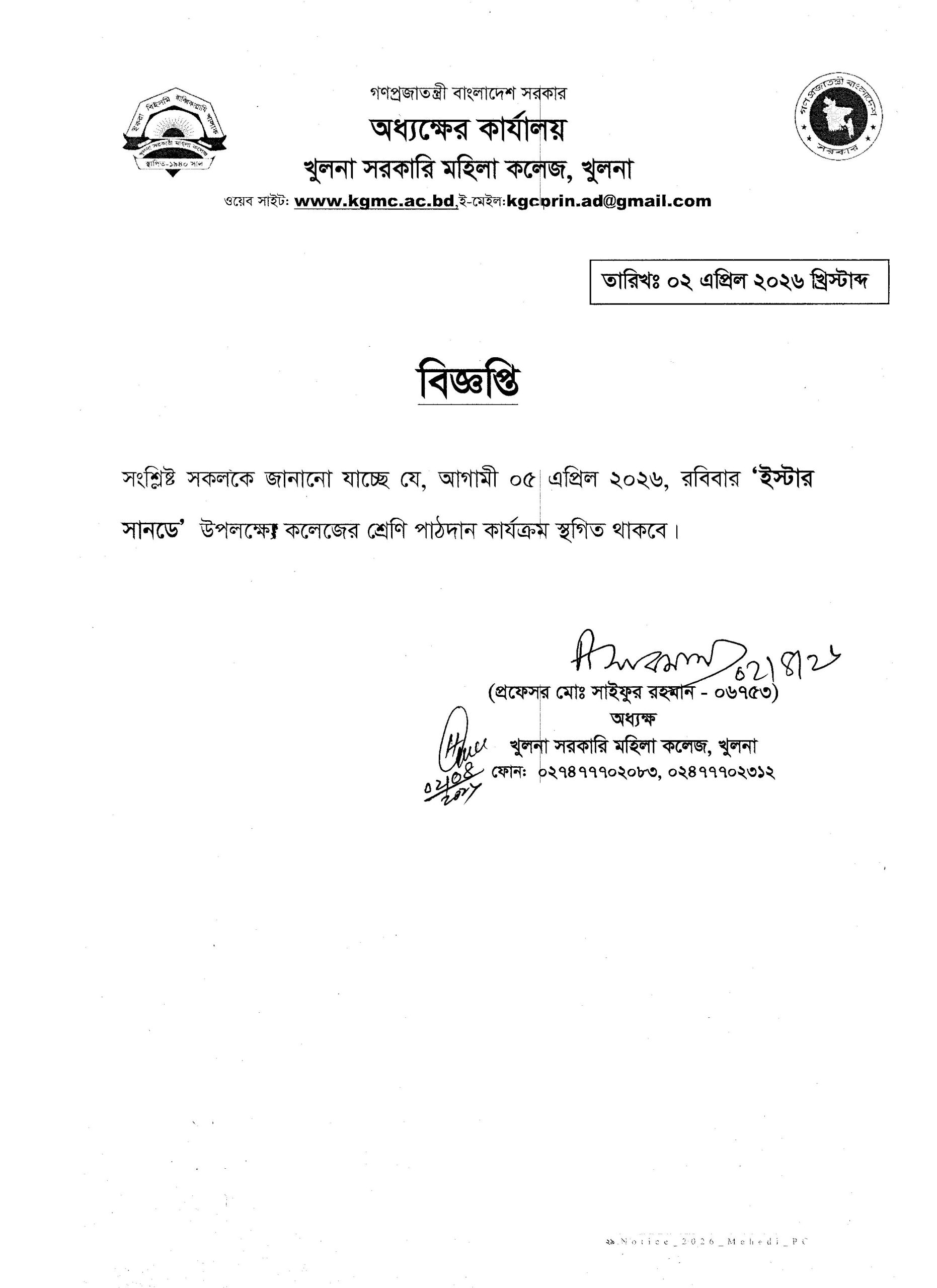 ক্লাস বন্ধের বিজ্ঞপ্তি